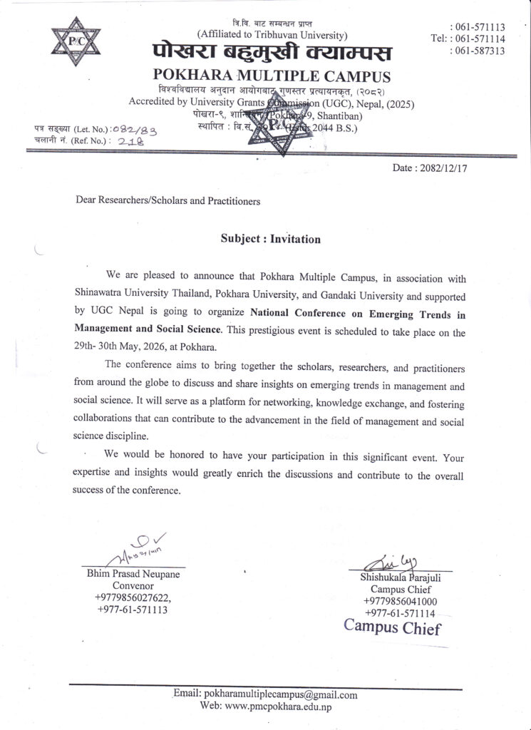 Notice! Invitation for 1st National Conference-2026 (2083) By Pokhara Multiple Campus|2026-03-31T06:47:36+00:00March 31, 2026|News and Events, Notice|0 Comments Share This Story, Choose Your Platform! FacebookTwitterRedditLinkedInWhatsAppTelegramTumblrPinterestVkXingEmail About the Author: Pokhara Multiple Campus Related Posts BA-BBS third year revised routine BA-BBS third year revised routine Revised Exam Schedule: 4-Years B.A., B.B.S,Third-Year Regular/Partial 2082 Revised Exam Schedule: 4-Years B.A., B.B.S,Third-Year Regular/Partial 2082 3 Year BA Change Exam Revised Routine 3 Year BA Change Exam Revised Routine स्नातक तहको मौका परिक्षा दिने बिद्यार्थीहरुको परिक्षा केन्द्र स्नातक तहको मौका परिक्षा दिने बिद्यार्थीहरुको परिक्षा केन्द्र Leave A Comment Cancel replyComment Save my name, email, and website in this browser for the next time I comment.